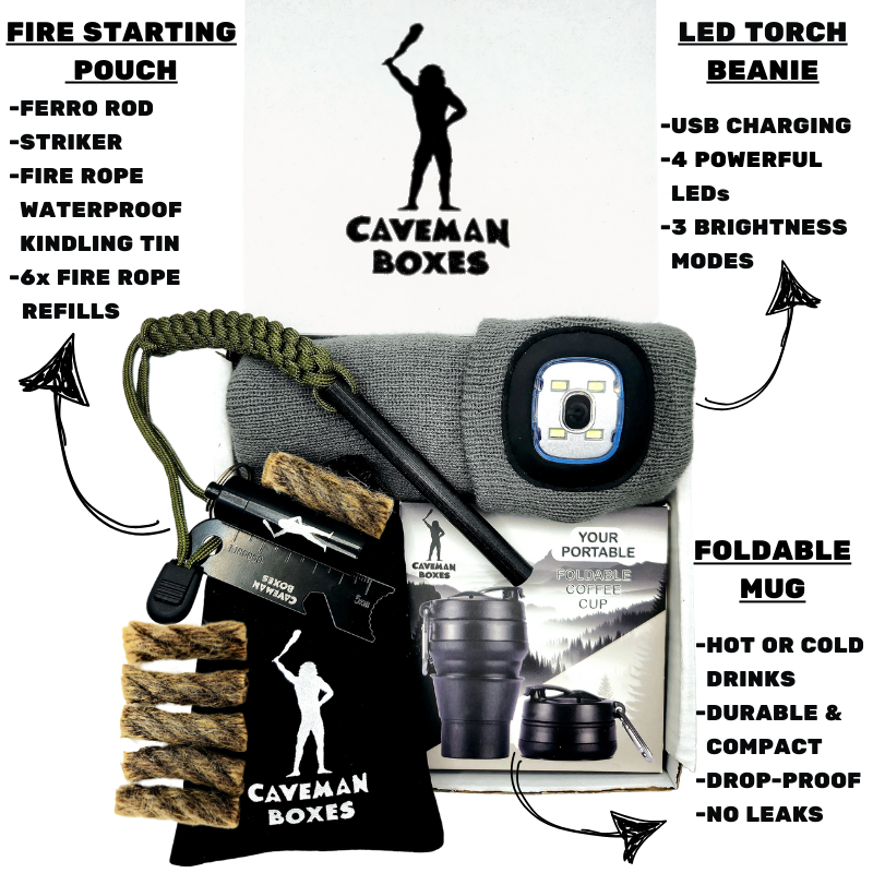 ALL-IN-ONE SURVIVAL GIFT BOX: The Caveman Survival Box is the ultimate adventure companion, packed with the tools to conquer the wild. Featuring a fire starting kit, a compact foldable mug, and a practical torch beanie to keep you prepared for any situation.